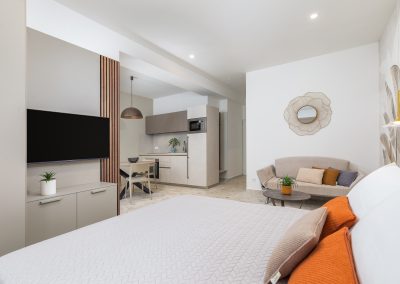 Wystrój wnętrz łączy nowoczesne meble, wysokiej jakości materiały oraz starannie dobraną paletę kolorów, tworząc wyrafinowaną i przyjemną atmosferę.
